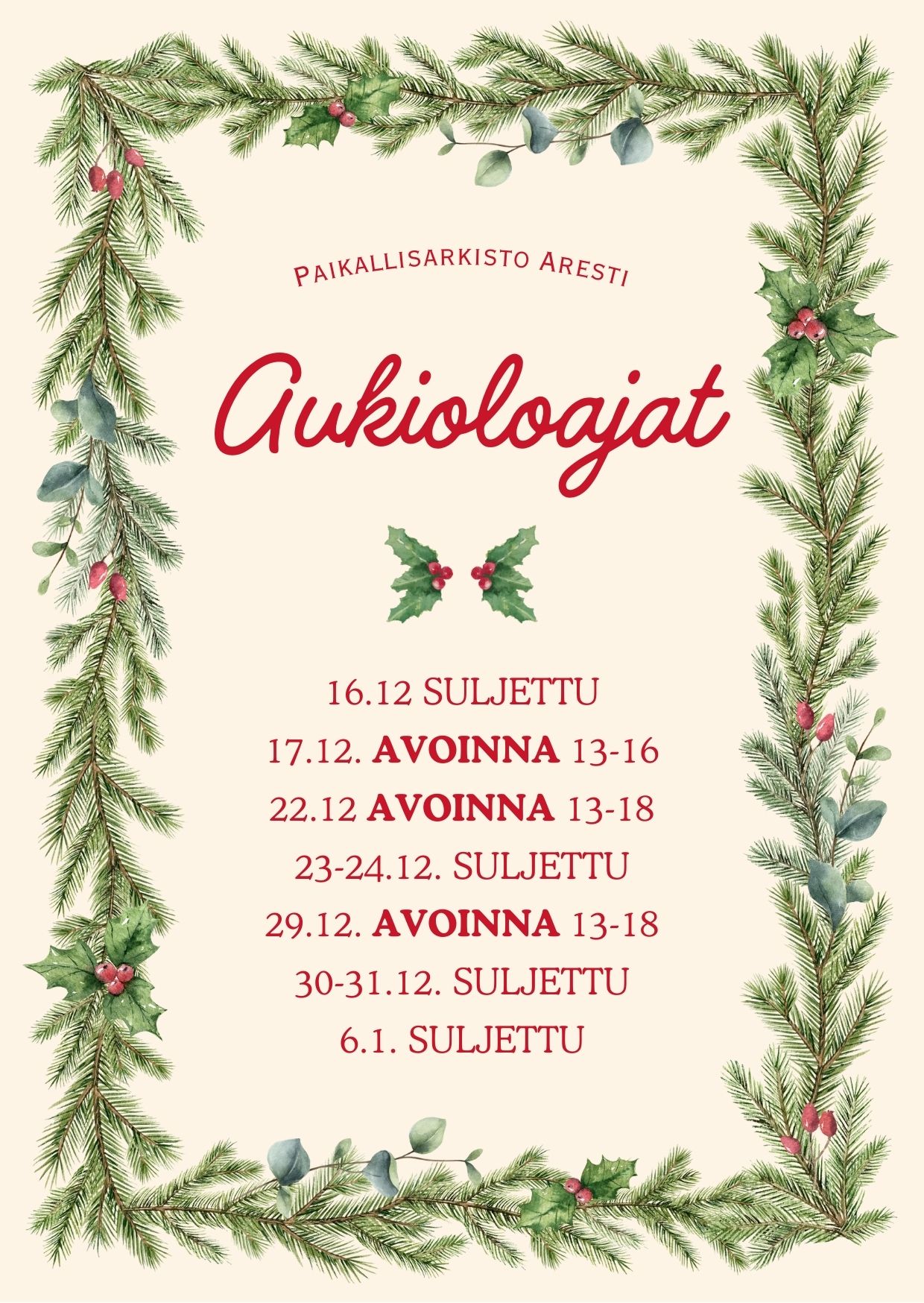 Paikallisarkisto Aresti on avoinna 7.1.2026 alkaen seuraavasti: