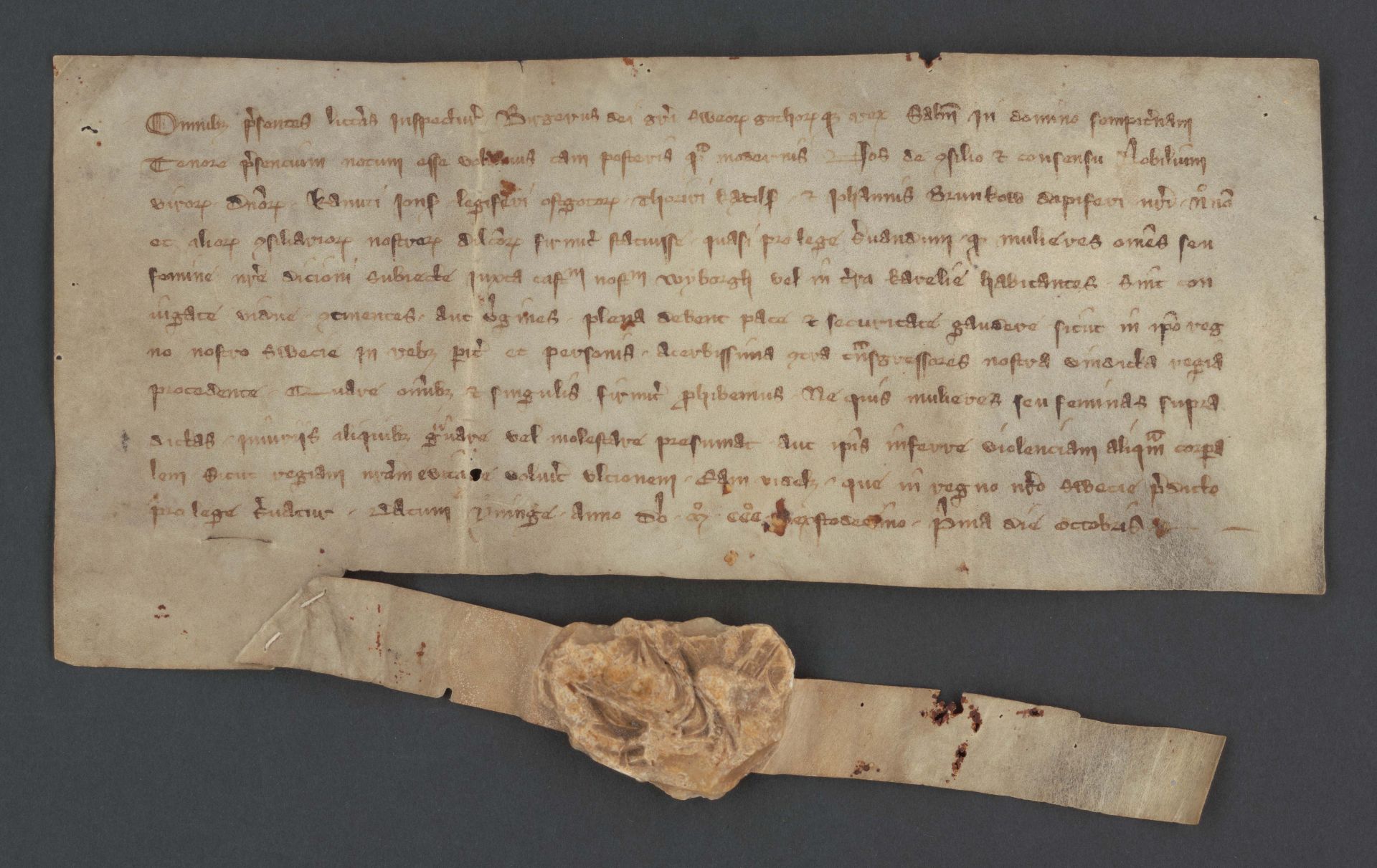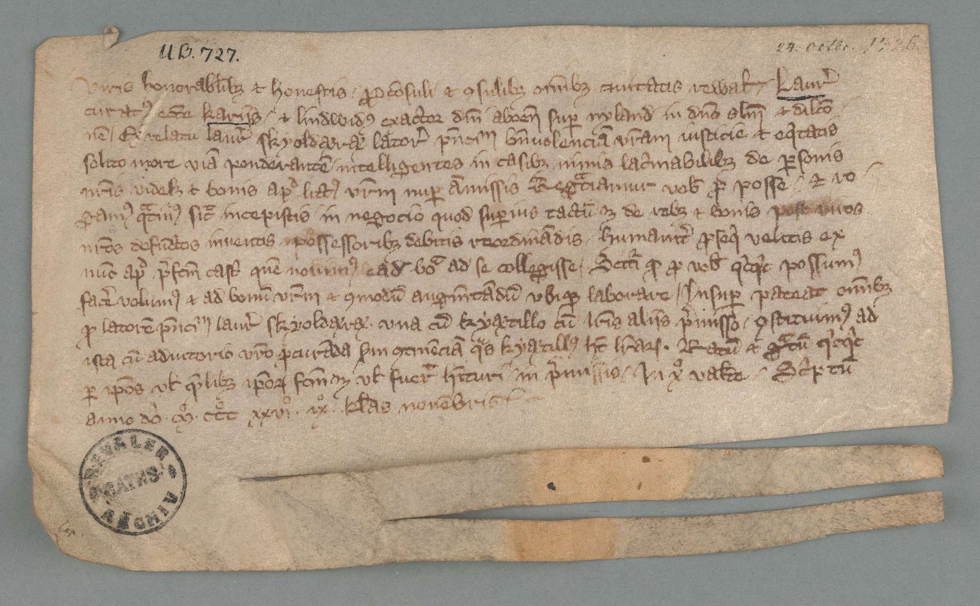 "Laurentius, Karjaan kirkkoherra, ja Lindvidus, Turun piispan vouti Uudellamaalla, Revalin raadille kiitoksena tiedosta Revalin rannikolla sattuneesta laivaonnettomuudesta sekä anomuksella, että kaksi heidän valtuutettuaan saisivat apua rantaan ajautuneen ja talteen otetun omaisuuden palauttamiseksi sen oikeille omistajille." Asiakirjaa säilytetään Tallinnan kaupunginarkistossa (Tallinna linnaarhiiv). Lähde: Diplomatarium Fennicum.