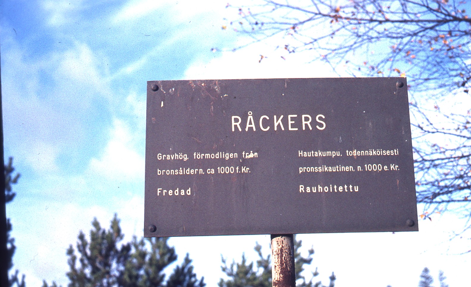 Råckersin pronssikautisten hautojen opaskyltti. Kuvaaja: Stig Nyström, tuntematon ajankohta. Lähde: Stig Nyströmin kokoelma, Paikallisarkisto Aresti.