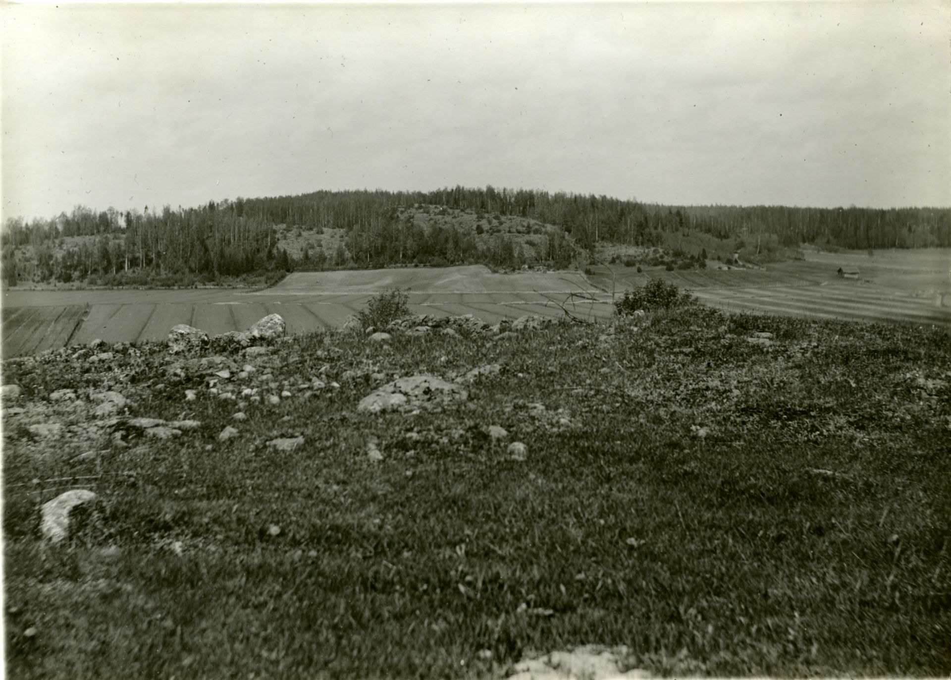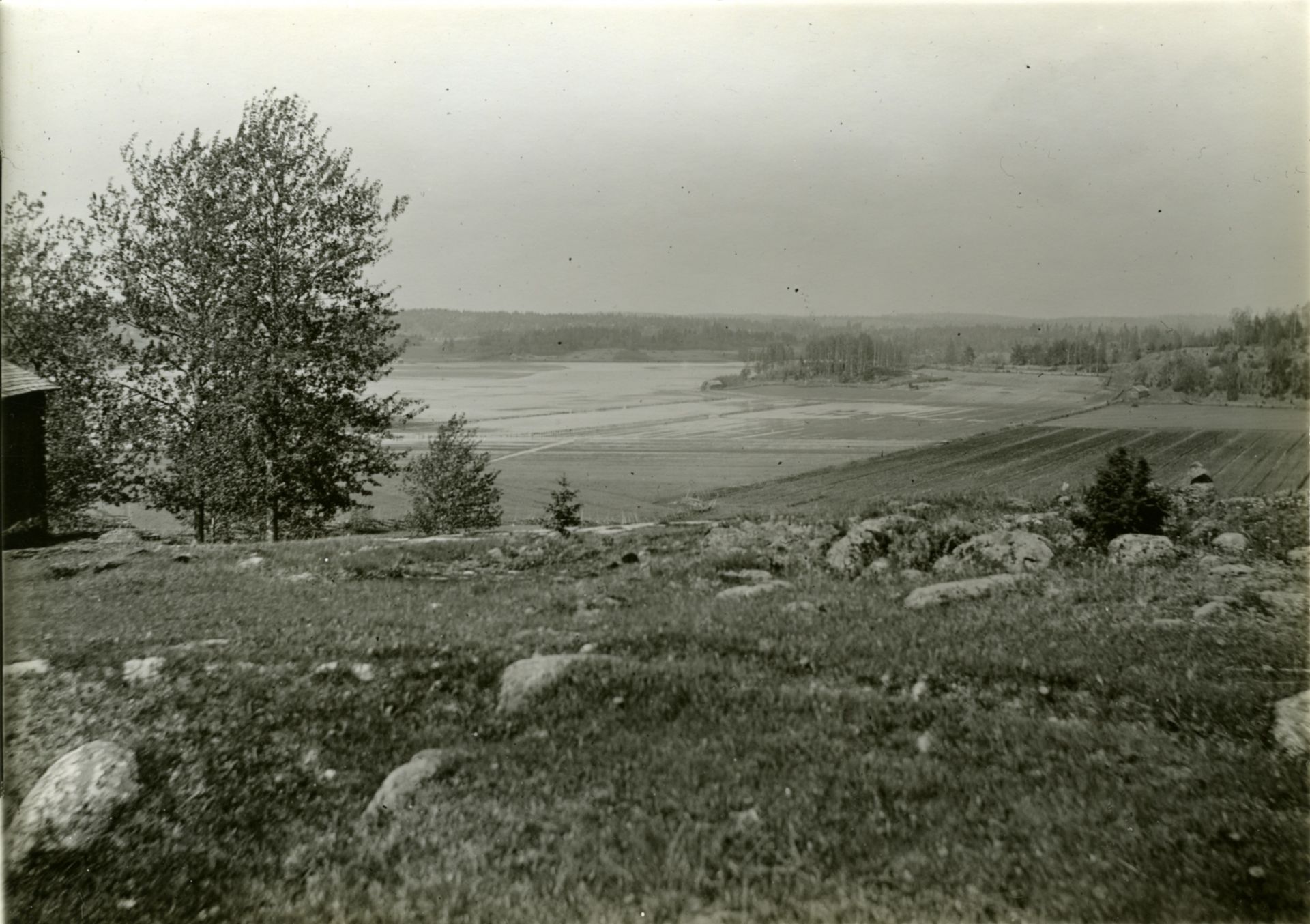 Valokuva otettu arkeologisten kaivausten yhteydessä. Kuva on otettu Meltolasta, Karjaalta, Sköljnäsuddenin suuntaan. Panoramakuvan osa. Kuvaaja: Alfred Hackman, 1916. Lähde: Volmar Svaetichinin kokoelma, Paikallisarkisto Aresti.