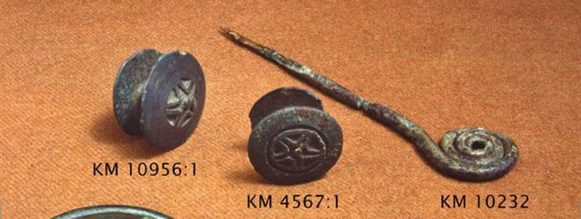 Pronssikausiset kaksoisnapit löydetty Råckersista. Oikealla oleva koruneula Vehmaalta. Lähde: Museovirasto, Finna.fi.